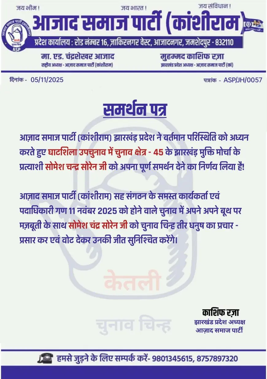 घाटशिला उपचुनाव (चुनाव क्षेत्र–45) में आज़ाद समाज पार्टी (कांशीराम) झारखंड प्रदेश ने झारखंड मुक्ति मोर्चा प्रत्याशी सोमेश चंद्र सोरेन को अपना पूर्ण समर्थन दिया है। प्रदेश अध्यक्ष मोहम्मद काशिफ रज़ा ने क्यों कहा कि यह निर्णय सामाजिक न्याय और हक-अधिकार की राजनीति को सशक्त करेगा? सोमेश चंद्र सोरेन को 'जमीनी नेता' क्यों माना गया? जानिए 11 नवंबर 2025 को होने वाले मतदान से पहले यह राजनीतिक एकता झारखंड की अस्मिता के लिए कैसे महत्वपूर्ण है।