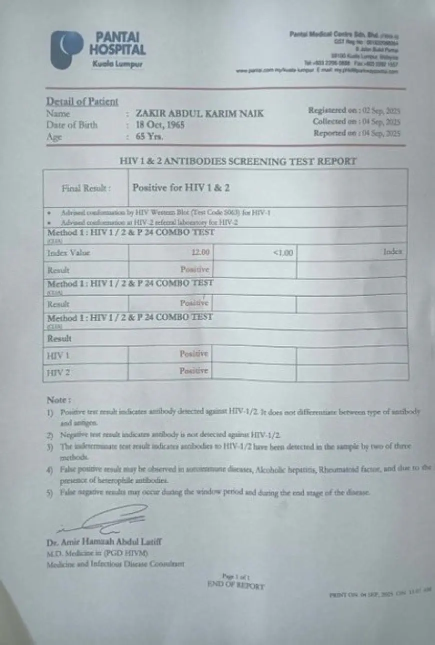 फातिमा खान, जो खुद को जर्नलिस्ट बताती हैं और उनके हैंडल पर 1 लाख 23 हजार से ज्यादा फॉलोअर्स हैं, ने 10 सितंबर 2025 को एक पोस्ट शेयर की। इसमें उन्होंने लिखा: "???? BREAKING: रैडिकल इस्लामी प्रीचर जाकिर नाइक को एड्स डायग्नोज्ड हो गया और वे मलेशिया में हॉस्पिटलाइज्ड हैं। उनकी पत्नी फरहत नाइक और बेटी जिक्रा नाइक भी एचआईवी पॉजिटिव पाई गईं। उनका इकोसिस्टम इसे छिपाने की कोशिश कर रहा है, ताकि धर्मांतरण का खेल चलता रहे। लेकिन गोपनीय मेडिकल डॉक्यूमेंट्स बताते हैं कि जाकिर नाइक को एचआईवी हो गया है।" पोस्ट के साथ दो इमेजेस अटैच की गईं – एक पंताई हॉस्पिटल कुआलालंपुर की मेडिकल रिपोर्ट, जिसमें मरीज का नाम 'जाकिर अब्दुल करीम' (जन्म 18 अक्टूबर 1965) लिखा है, और रिजल्ट पॉजिटिव। दूसरी इमेज में विस्तार से इंडेक्स वैल्यू 12.00 (<1.00 कटऑफ से ऊपर) दिखाई गई, जो एचआईवी 1/2 कॉम्बो टेस्ट और वेस्टर्न ब्लॉट से कन्फर्म है। सैंपल 31 अगस्त को लिया गया, रिपोर्ट 1 सितंबर 2025 की। डॉ. अमीर हमजाह अब्दुल लतीफ के साइन के साथ फुटनोट्स में फॉल्स पॉजिटिव की चेतावनी भी है – जैसे ऑटोइम्यून डिजीज या विंडो पीरियड।